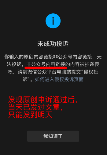 等申诉成功了,没有链接,怎么在手机端投诉抄袭?谁时时刻刻申诉完了,还记得要保留抄袭者的文章链接?你以为全部人都是产品经理、技术员吗?