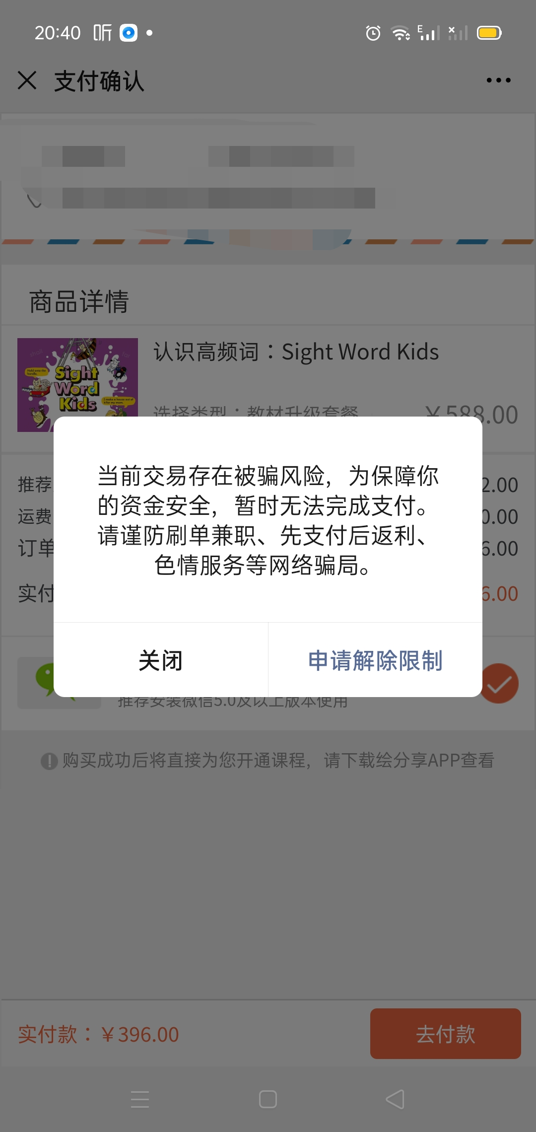 引导用户点击【申请解除限制】,按照流程去操作解除后继续发起支付。
