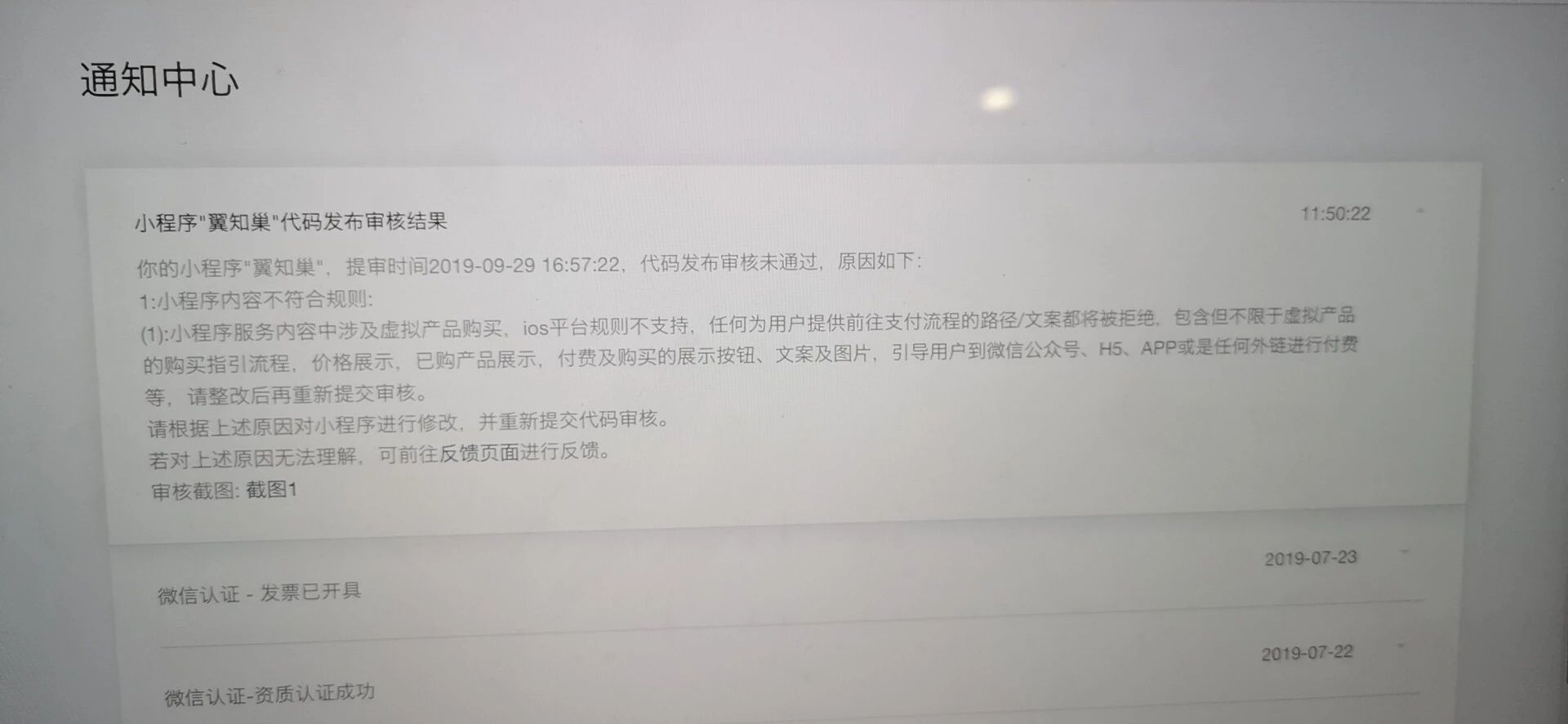 (1):小程序服务内容中涉及【续费】虚拟产品购买,ios平台规则不支持,任何为用户提供前往支付流程的路径/文案都将被拒绝,包含但不限于虚拟产品的购买指引流程,价格展示,已购产品展示,付费及购买的展示按钮、文案及图片,引导用户到微信公众号、H5、APP或是任何外链进行付费等,请整改后再重新提交审核。