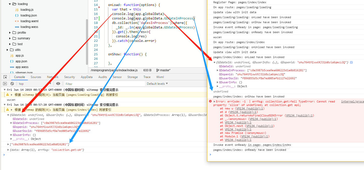 回调打印是否有问题,取决于where查询的条件的传值是否正常。如果我在调用下面的数据库前,将app.globaldata.GDdateInProcess进行写死赋值,下面的数据库查询是可以正常回调的。所以,和下面的调用数据库关系不大。应该还是在上面这步的globaldata赋值取值问题上