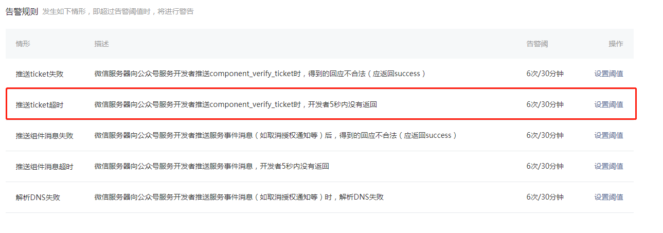 推送ticket超时:微信服务器向公众号服务开发者推送component_verify_ticket时,开发者5秒内没有返回。