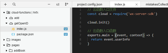 第四,新建目录,然后app.json添加配置指向这个目录,然后新建node云函数,不需要在云中建立函数云中会自动生成