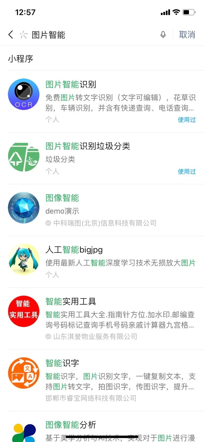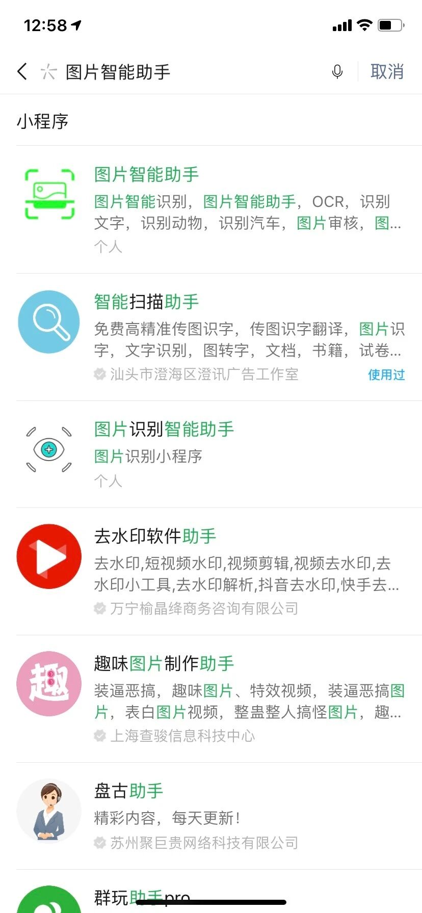 描述:小程序必须全名("图片智能助手")才能搜索到,使用"图片智能","图片助手"等关键词都搜不到