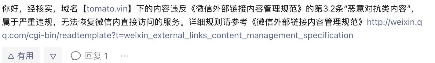 你好,经审核,域名【tomato.vin】下的链接【https://h5.tomato.vin/#/】的内容严重违反《微信外部链接内容管理规范》的第第2.9条“垃圾广告类内容”,无法恢复微信内直接访问的服务。详细规则请参考《微信外部链接内容管理规范》http://weixin.qq.com/cgi-bin/readtemplate?t=weixin_external_links_content_management_specification