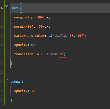 一个简单的过渡动画效果, 点击测试按钮, box 延迟 2s 后,由 透明度0 过渡5s 变成 透明度1。