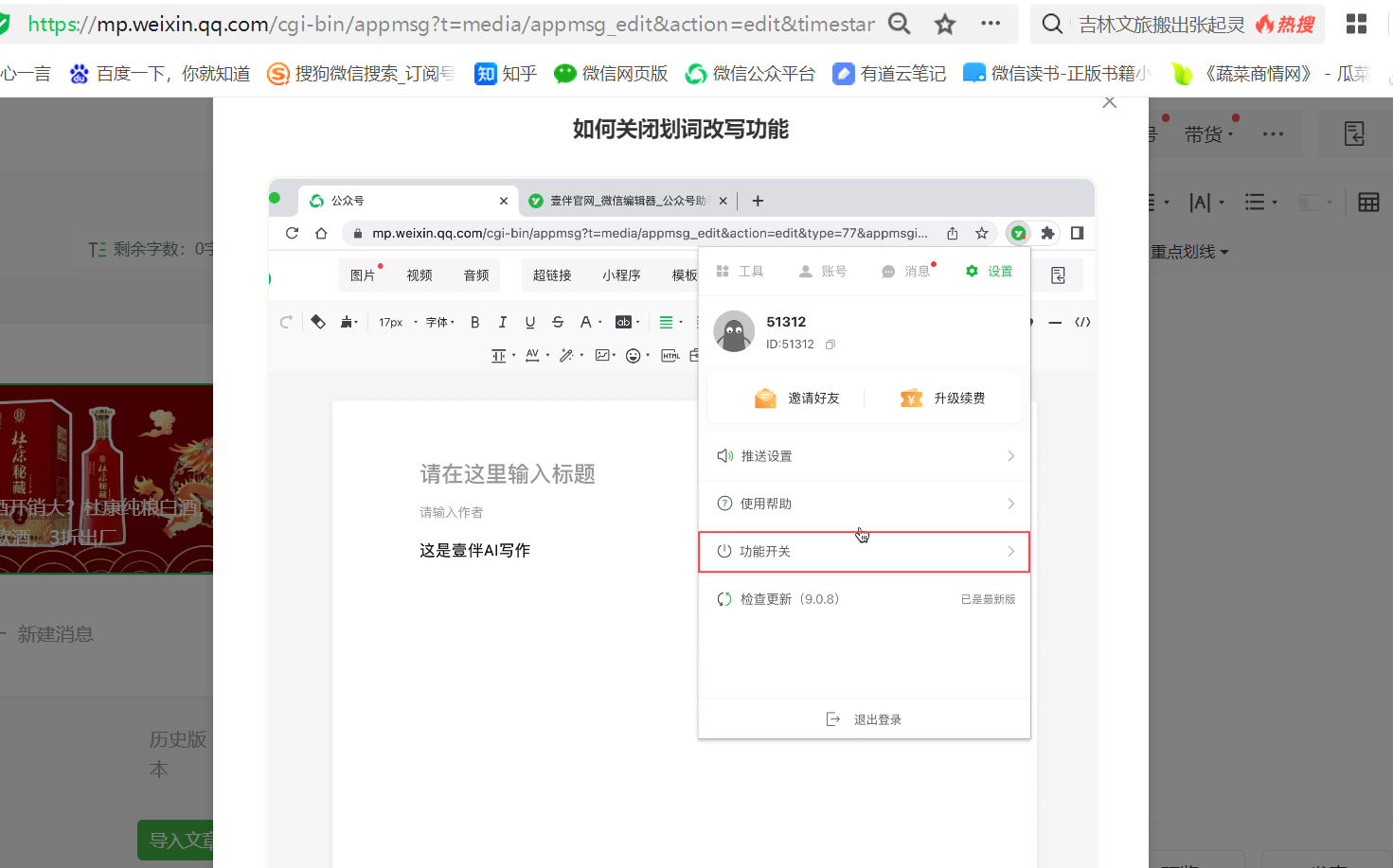 【问题描述】: 编辑里选中文字,就会跳出AI写作助手,很影响写作体验,很烦人,关都找不到开关。