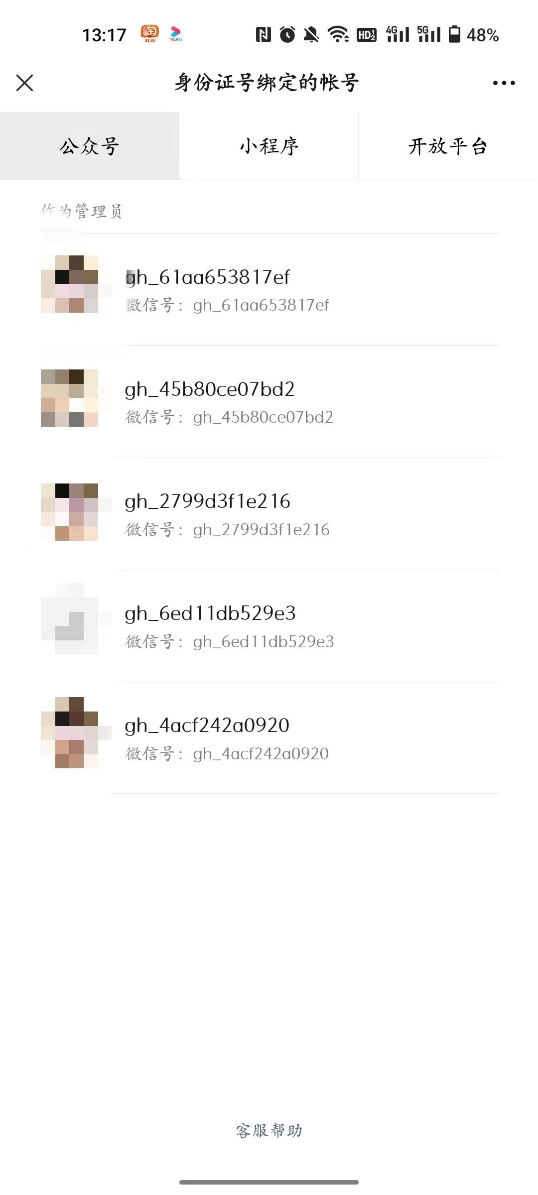 公众号“公众平台安全助手(mphelper)”,点击底部菜单栏“绑定查询”选择“身份证绑定帐号”查询该身份证下绑定的公众号