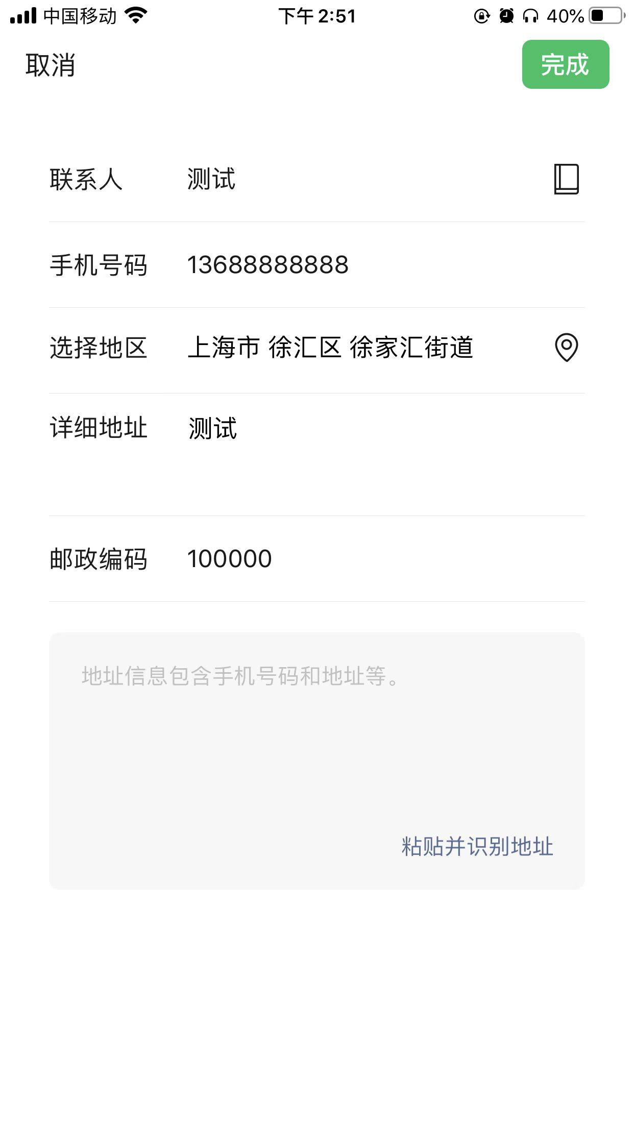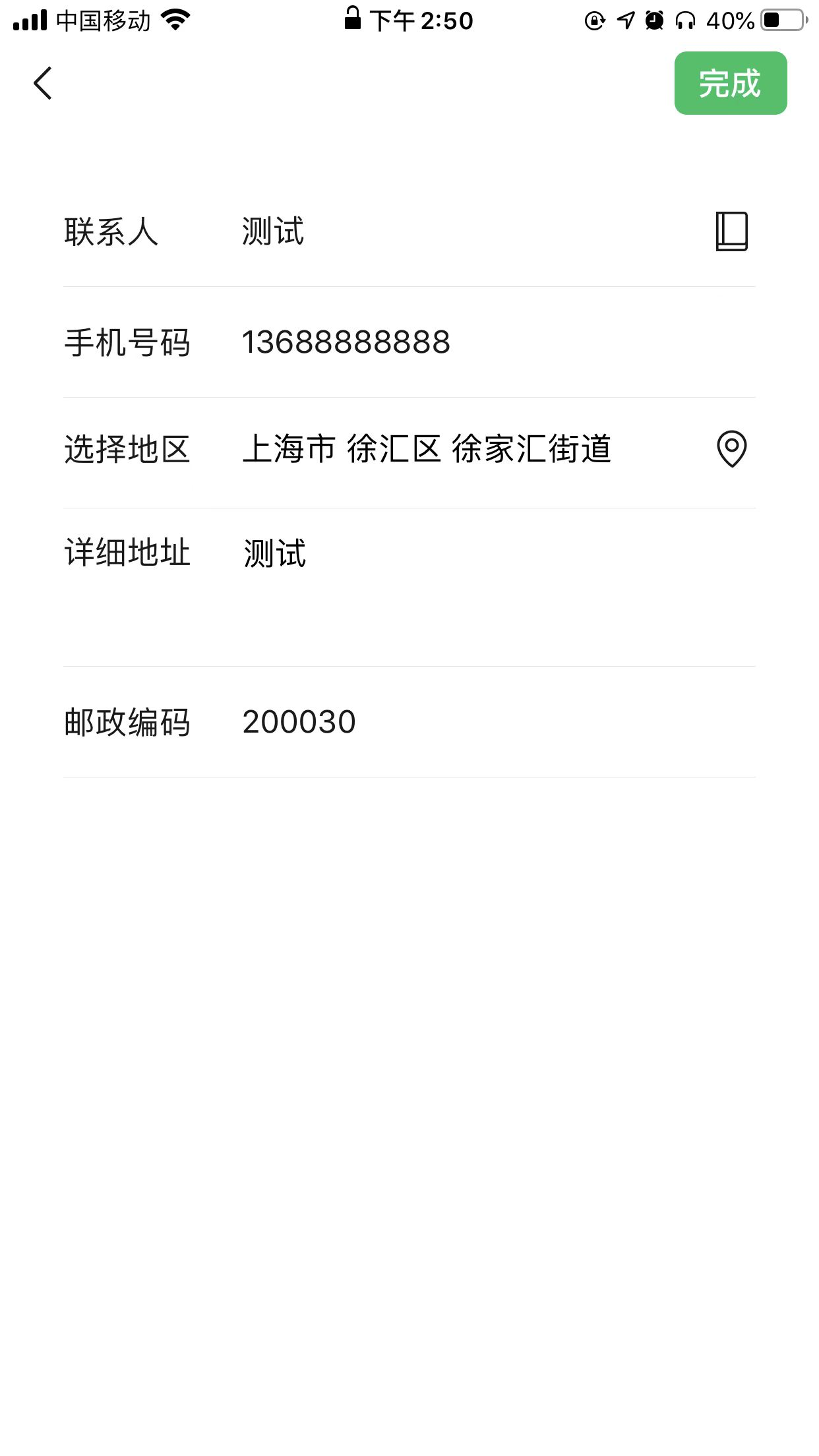 微信app中的收获地址,选择完地区后,邮政编码会自动填充成200030,修改成100000后保存,再点击编辑的时候,邮政编码显示的却是200030