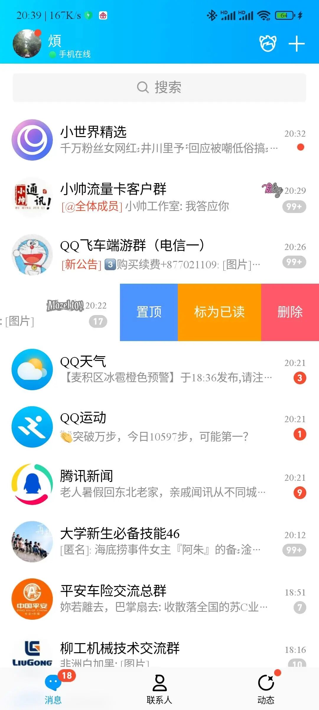 不是有了吗,长按信息栏,未读,顶置,不显示,删除。