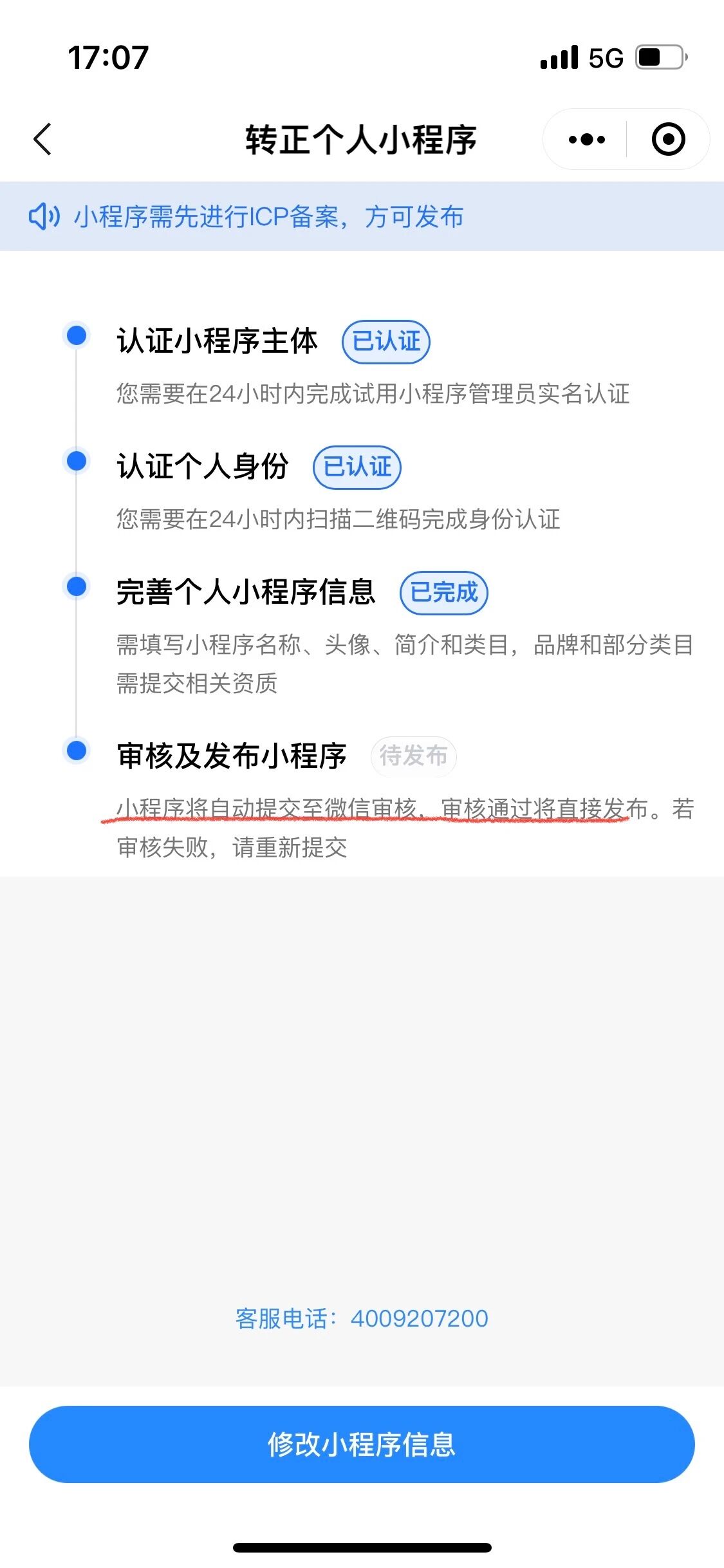 小程序备案已经审核通过,但是小程序一直不能发布,提示“提交微信审核”,也没收到什么结果通知,已经一个月了,不知道什么情况?