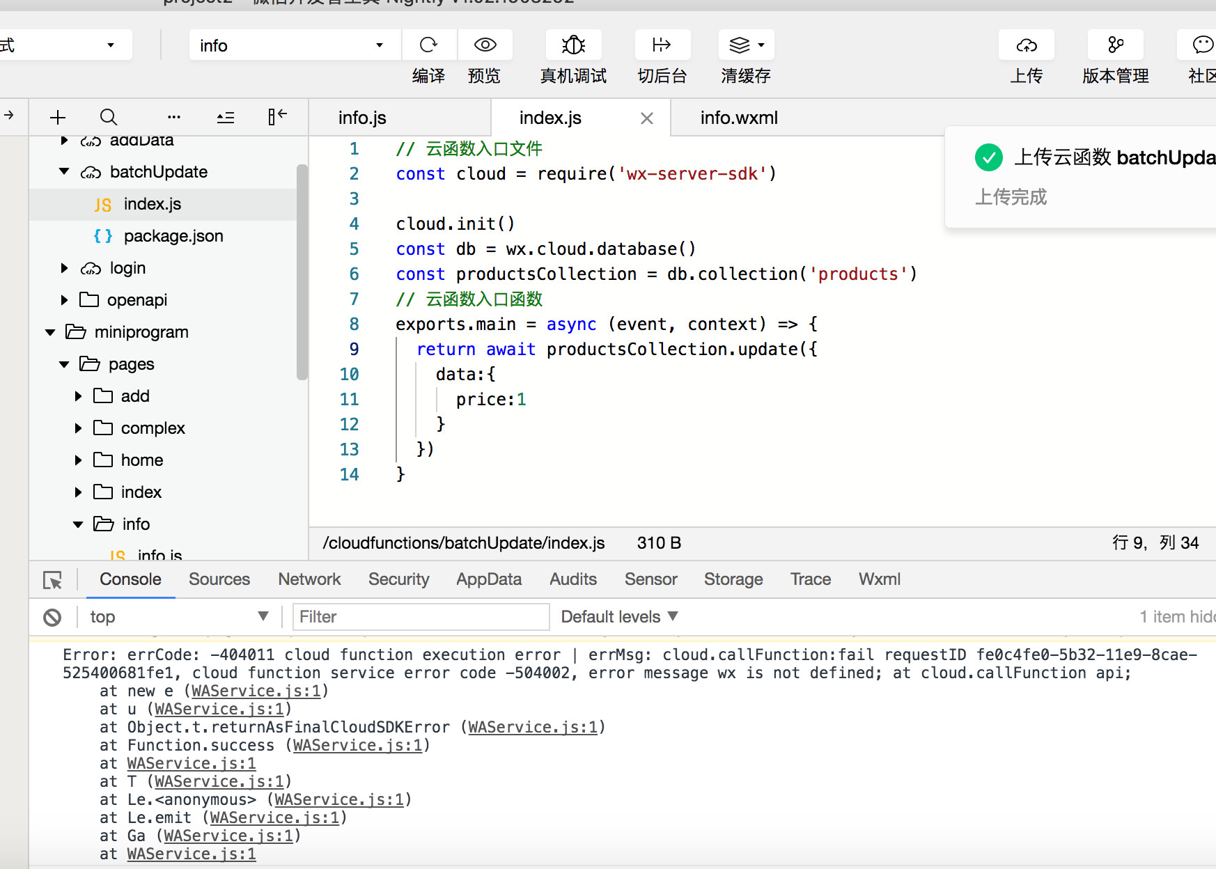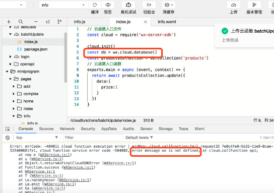 是你的batchUpdate 云函数报错了:wx is not defined,检查一下batchUpdate这个云函数吧
