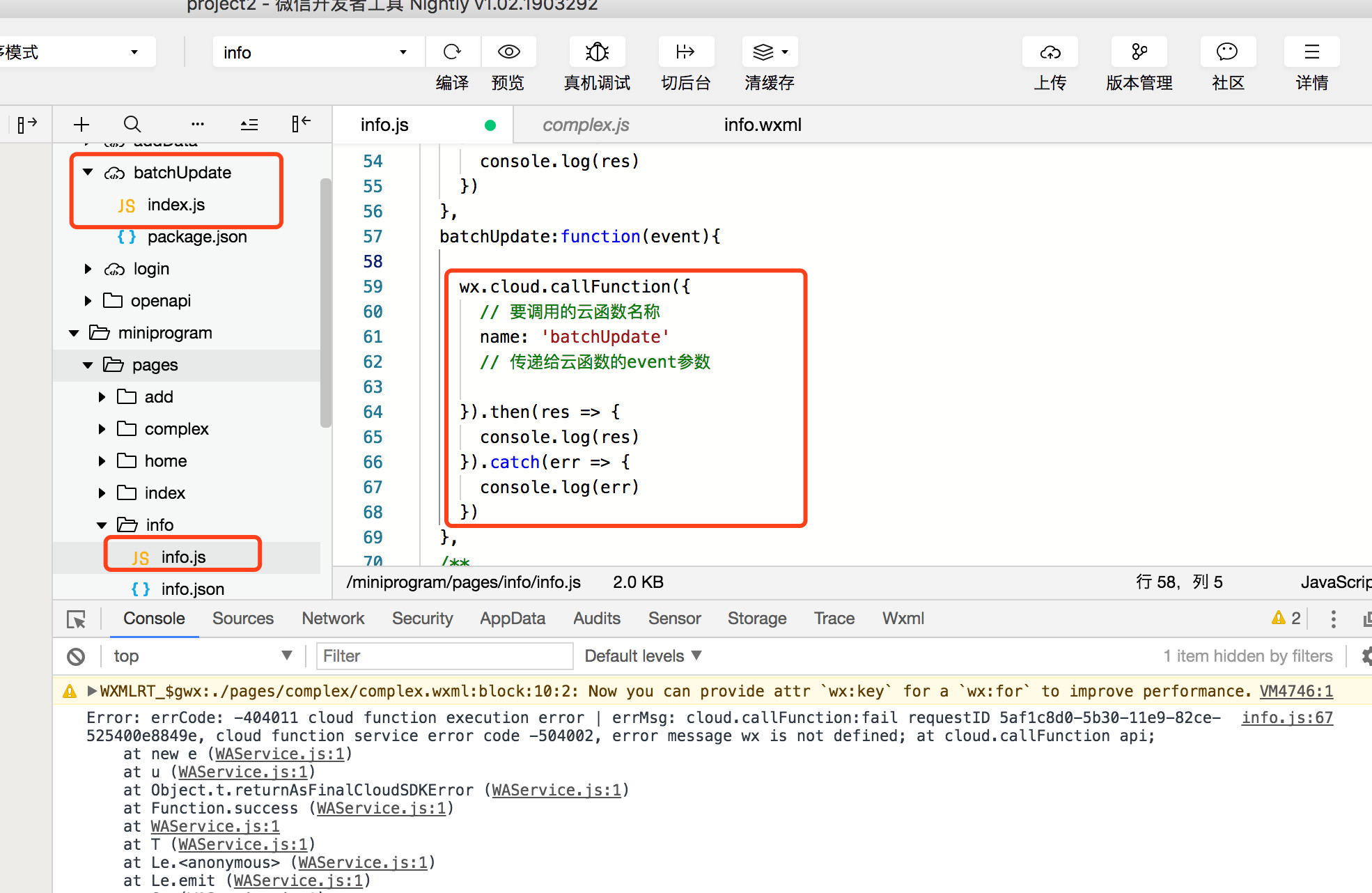 Error: errCode: -404011 cloud function execution error | errMsg: cloud.callFunction:fail requestID 87882a65-5ae1-11e9-82c9-525400e8849e, cloud function service error code -504002, error message wx is not defined; at cloud.callFunction api;