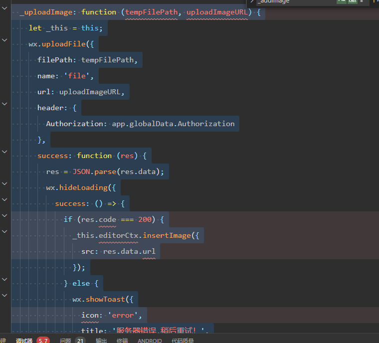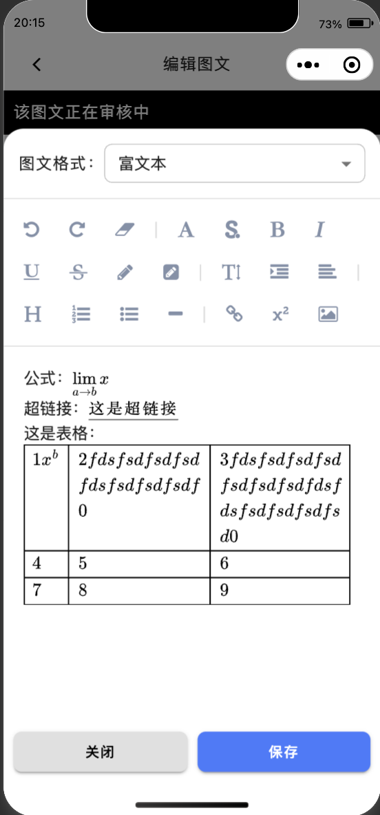 async insertLink() {const { edit_index, link_text, link_url } = this.stateif (edit_index >= 0) {await this.props.getEditorContext().deleteText({index: edit_index,length: 1,})await this.props.getEditorContext().setSelection({index: edit_index,length: 0,})}let link_info = TexUtil.generateTexInfo(`\\underline{${link_text}}`)// console.log(link_info)this.props.getEditorContext().insertImage({extClass: link_info.extClass,src: link_info.src,nowrap: true,alt: link_text,data: {data: WXEditorHelper.encodeDataCustom({type: 'link',href: link_url,text: link_text})},width: link_info.width,height: link_info.height,})console.log('link ext class:', link_info.extClass)this.closeLinkDialog()}async onClickEditor(e) {const { x, y } = e.detail// console.log(x, y)let data_res = await this.editor_context.getContents()// console.log(data_res)let all_length = this.getWxDeltaLength(data_res.delta)// console.log('all_length:', all_length)// 二分法应该可以优化,规模小暂时不优化for (let i = 0; i < all_length; i++) {let bounds_res = await this.editor_context.getBounds({index: i,length: 1,})let bounds = bounds_res.bounds// console.log(bounds)if (bounds.left <= x && x <= bounds.left + bounds.width &&bounds.top <= y && y <= bounds.top + bounds.height) {// console.log('click on index:', i)let item_type = this.getWxDeltaIndexType(data_res.delta, i)// console.log('click on type:', item_type)if (item_type.type != 'text') {this.onClickItem(i, item_type.type, item_type.data, item_type)}break}}}@maxWidth: 100;@maxHeight: 100;@minVerticalAlign: -100;@maxVerticalAlign: 100;// 下面width、height、verticalAlign均为公式图片所需样式// 批量生成宽度样式.generateWidth(@n) when (@n > 0) {.width-@{n}em {width: (@n / 10em);}.generateWidth(@n - 1);}.generateWidth(@maxWidth);// 批量生成高度样式.generateHeight(@n) when (@n > 0) {.height-@{n}em {height: (@n / 10em);}.generateHeight(@n - 1);}.generateHeight(@maxHeight);// 批量生成对齐样式.generateVerticalAlign(@n) when (@n > @minVerticalAlign) {.verticalAlign-@{n}em {vertical-align: (@n / 10em);}.generateVerticalAlign(@n - 1);}.generateVerticalAlign(@maxVerticalAlign);length: 1,