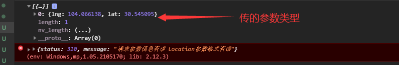 根据文档,geocoder解析出来的 res.result.location是个字符串,你把他放进 了数组里 作为calculateDistance的to 参数就错误了,所以310报的很明显,就是参数错误。