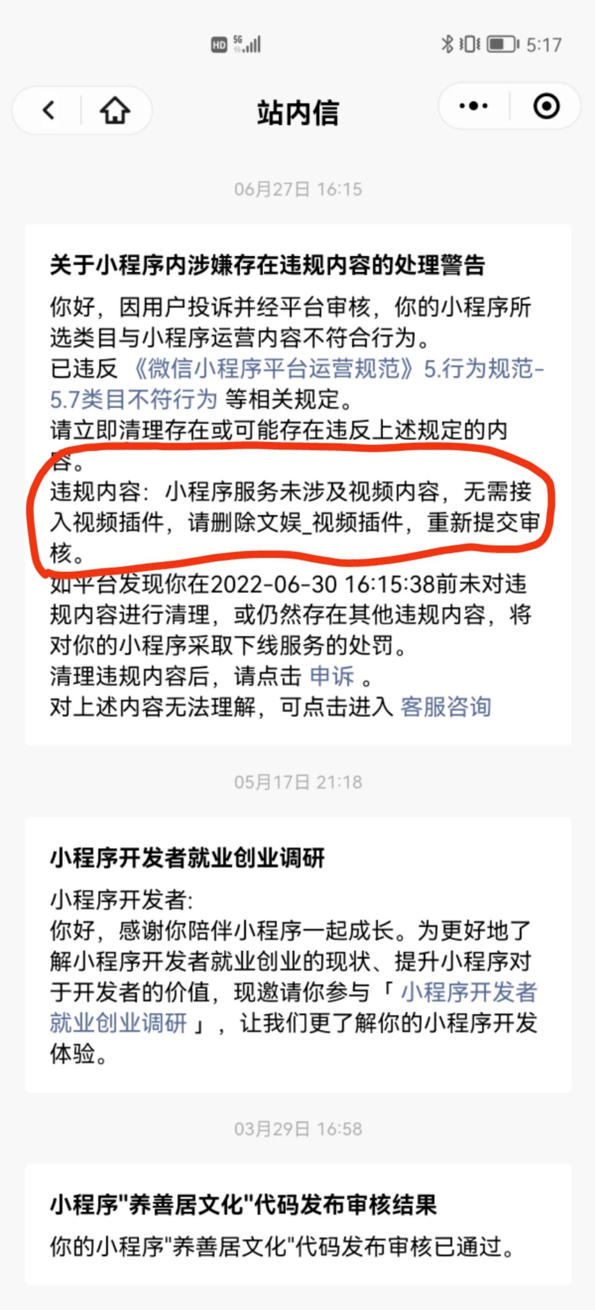 您好技术员,我收到微信通知小程序违规,内容:小程序服务未涉及视频内容,无需接入视频插件,请删除文娱_视频插件,重新提交审核。但是我小程序里面没有视频,只有图片,而且我也不懂哪些是文娱视频插件 ?麻烦告知,谢谢。