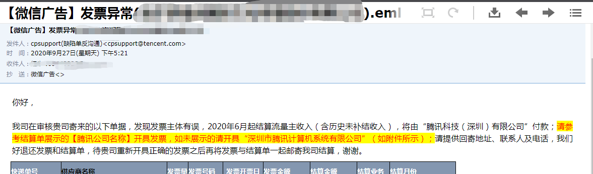 我公司11月13日收到cpsupport@tencent.com的邮件,邮件说我公司2018年11月-2019年9月结算共用一张发票,2019年9月的结算需要单独开具发票。要我们提供收件人地址信息,退还给我们发票和结算单,我们已经给了地址信息,为何发票和结算单一直没有退还给我们?我们打了许多电话,都联系不到人!请有关人员能给一个答复,谢谢!