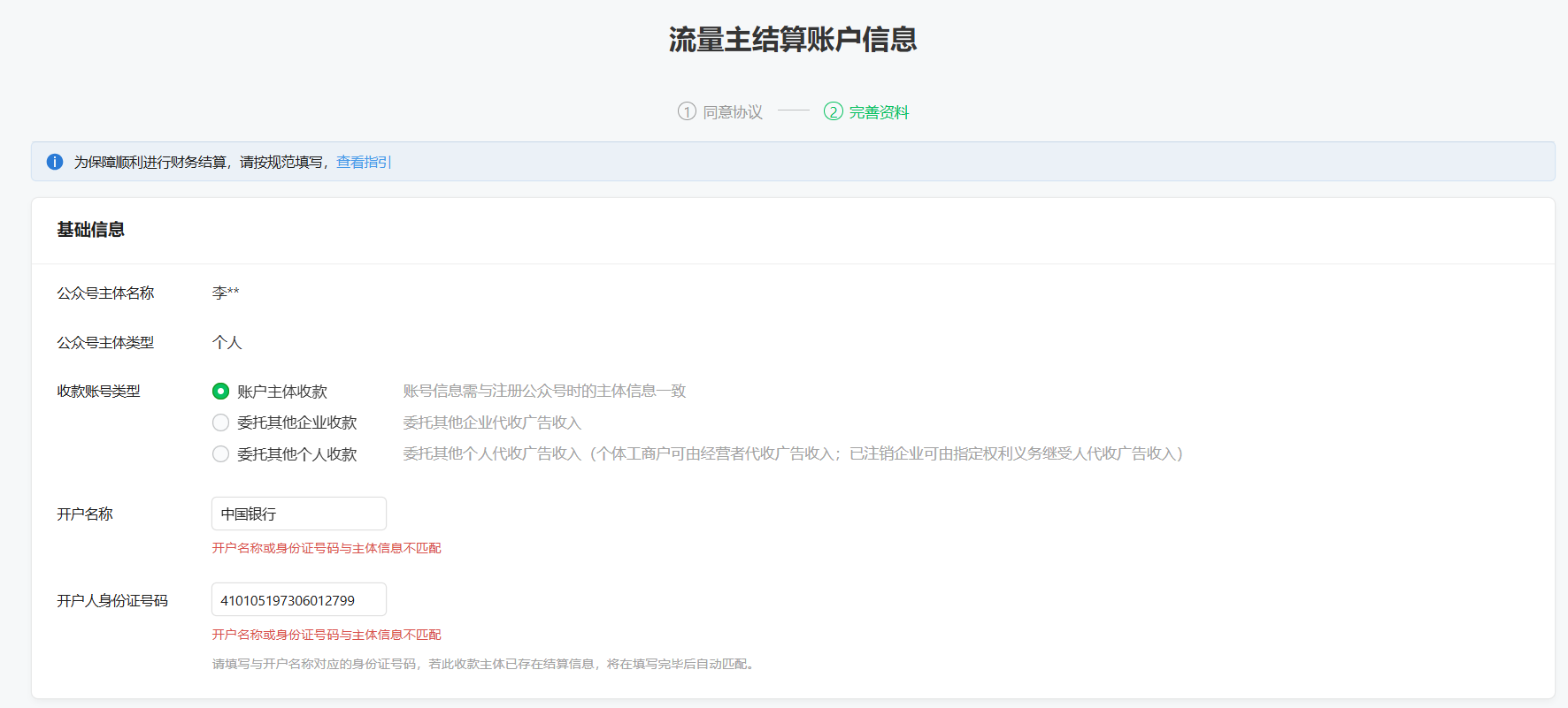 我在“流量主结算账户信息”填写时遇到问题,系统提示我开户名称与身份证号码主体信息不匹配,实际情况是注册主体、银行卡号、身份证号码全是正确的……