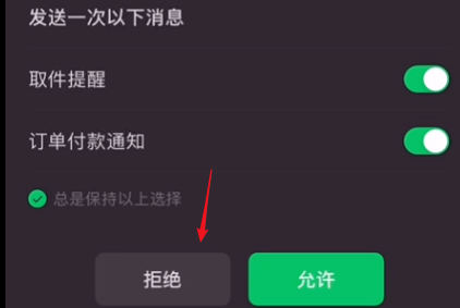 用户进入小程序,通过操作激活了订阅消息的弹窗,不论我选择两个两个选项是否开关,只要我点击 总是保持以上选择,并且是点击了拒绝按钮的情况下,