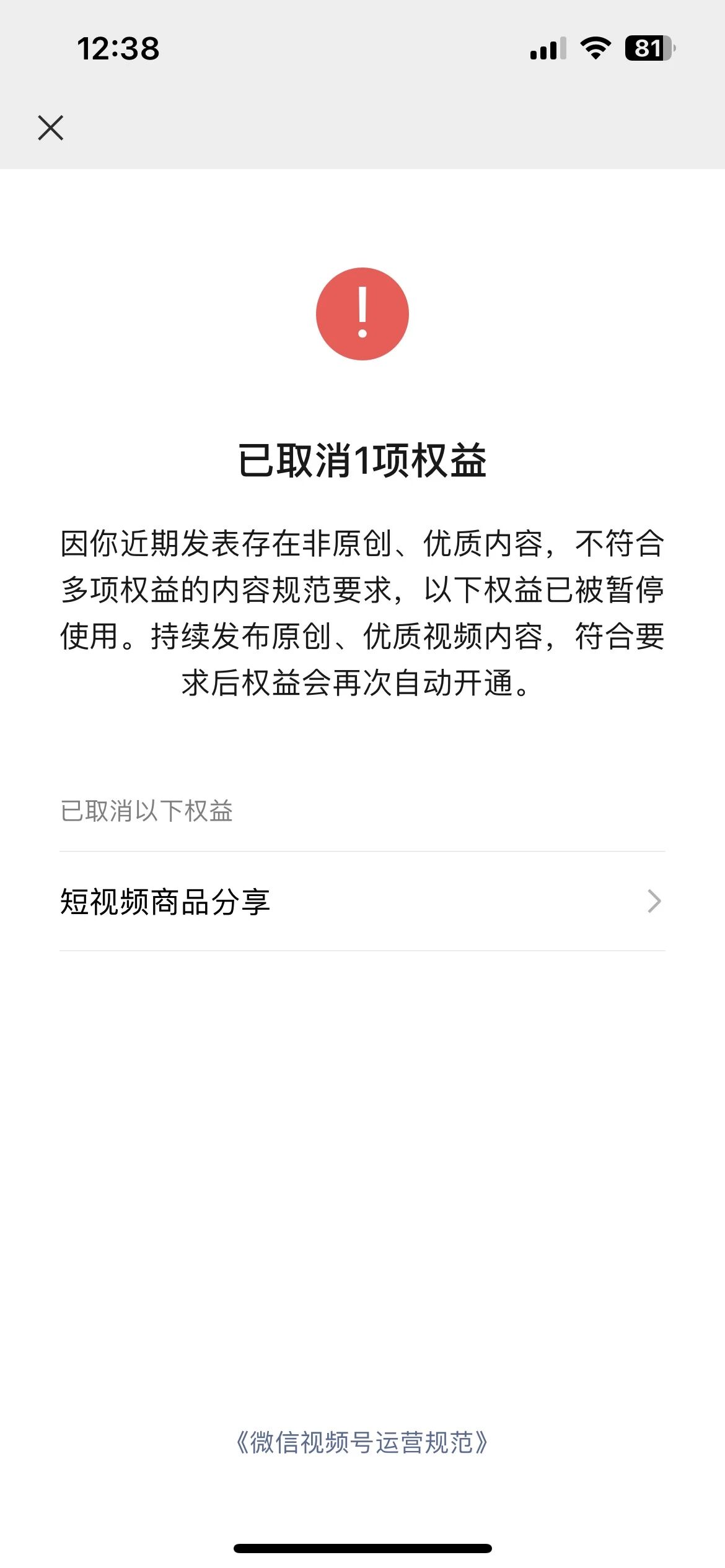 由于你近期部分发文为非原创、优质内容,你收到了商品分享权益通知或者商品分享权益已失效,持续发布原创、优质视频内容,符合要求后权益会再次自动开通,再次开通会有私信通知。如果你对处罚结果有异议,请提供原创证明材料(包括其他视频平台的同帐号名称登陆页面、原始视频素材截图、剪辑软件截图等等)提交相关资料至邮箱 channels@tencent.com。我们将重新判定你的处罚结果。