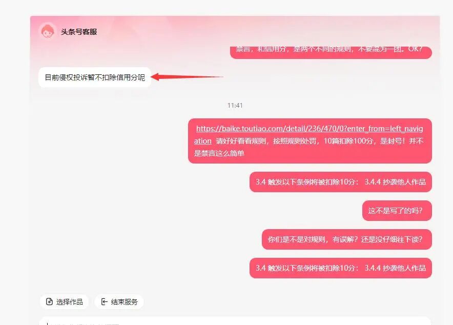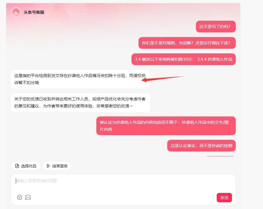 看看他们客服是怎么狡辩的,说这是发文检测,如果检查是抄袭就扣除10分,而不是被处罚认定的抄袭!这是什么强盗逻辑?上面写的是被认定为抄袭他人作品的内容。被他们说成是预览时候的检测,这种预览检查,还能被处罚?这真是惊呆了我的三观。抄袭认定不被处罚,只是检测被处罚。这跟规则上说的牛头不对马嘴!