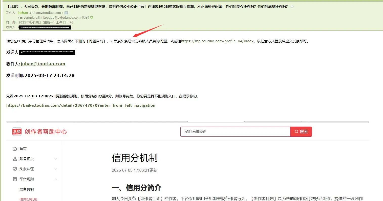 今日头条平台大量抄袭微信公众号原创文章,并于上个月修改了规则,将违法侵权改为,永不处罚抄袭者,不扣除信用分,这个平台就是抄袭者的保护伞平台,为今日头条大量抄袭微信公众号平台,谋取长期利益。该信用分机制规则,是2025年7月更新的,这是链接地址:https://baike.toutiao.com/detail/236/470/0?enter_from=left_navigation