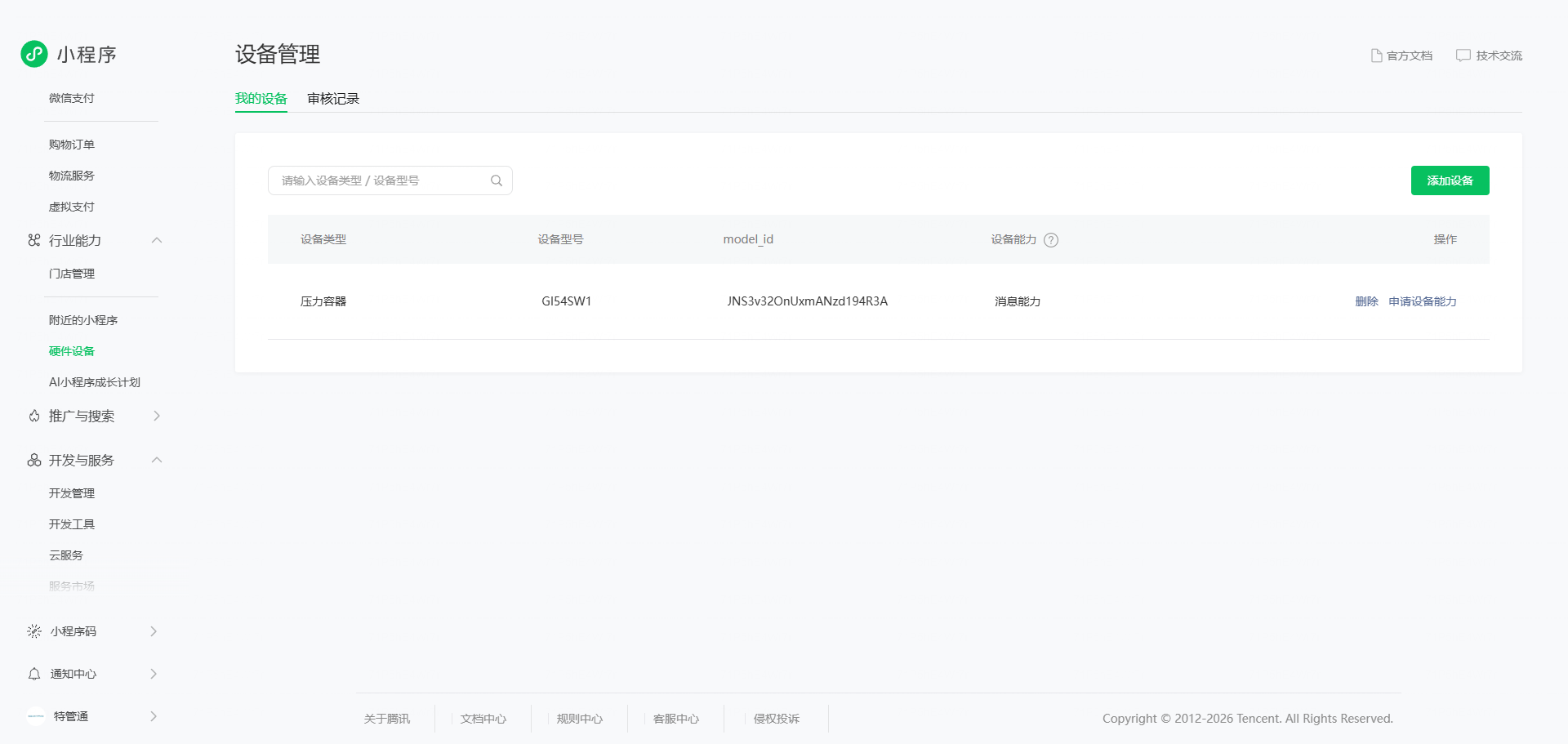 公司在开发一款设备管理的小程序,功能如下:用户使用我们的平台,添加自己的设备,包括但不限于电梯,压力锅等设备;设有检修人员,设备管理员两种角色。主要对设备的巡检、检修,检修结果等做异常设备上报,检修结果通知。目前小程序已通过了设备消息能力审核,类目是设备管理,现在想新增长期订阅模板。现将相关信息同步至此,辛苦帮助评估。