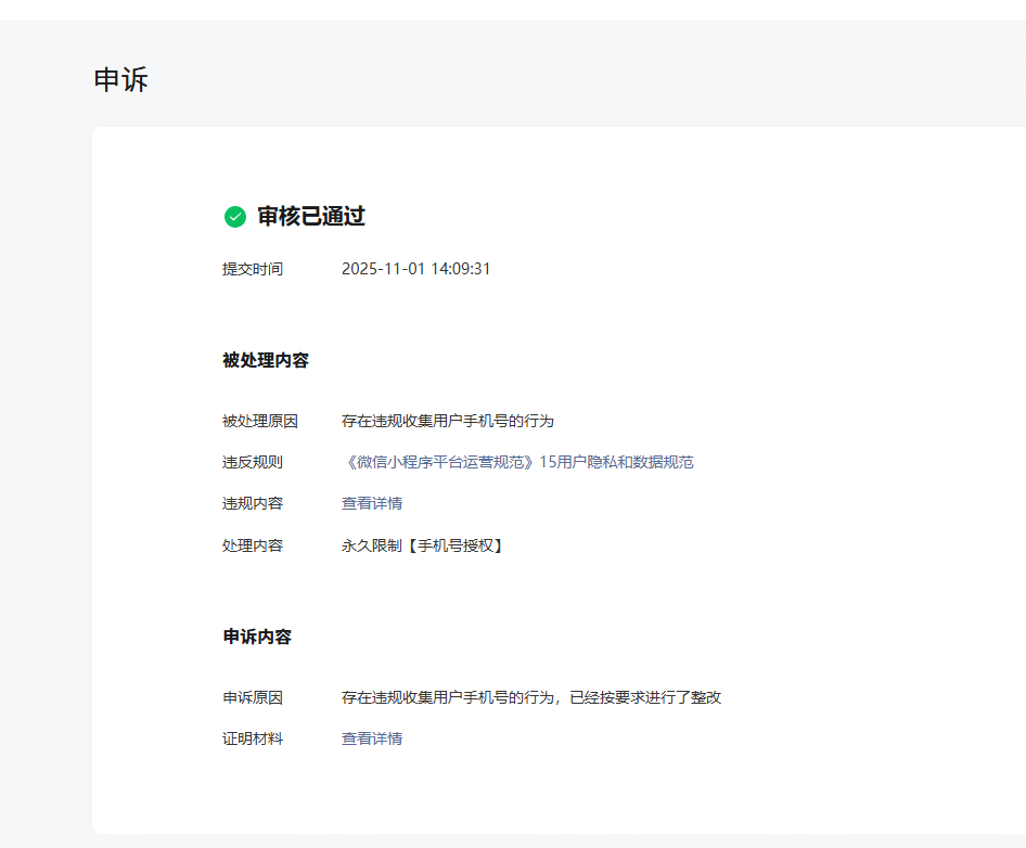 你好,经核实,小程序涉及收集用户手机号违规,建议查看2025-10-03站内信整改发起申诉。