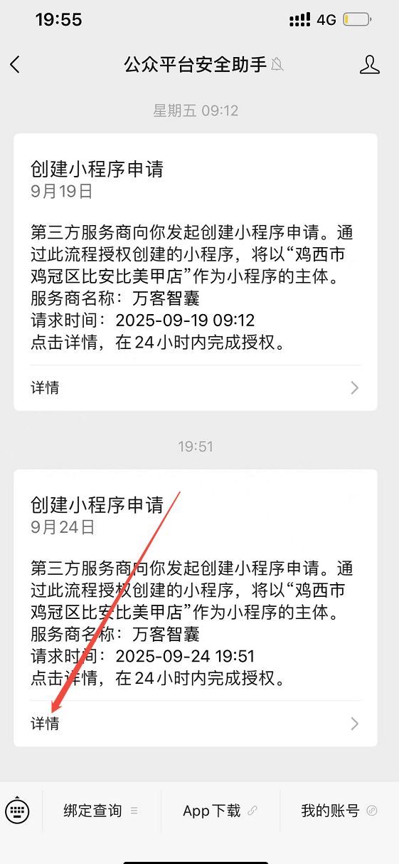 客户之前关注微信公众平台是可以接收到“创建小程序申请”,但是取消关注之后,之前的消息也不见了,后面一直点击提交,但是法人微信说一直收不到消息。客户微信号:yan13089790599