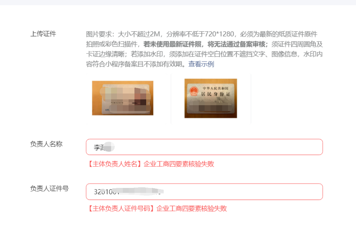 微信小程序,点击去备案,上传主体负责人信息,提示企业工商四要素核验失败。