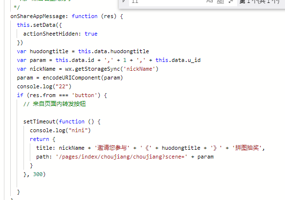 页面内有一个按钮,点击 然后调起 shade,然后又点击邀请微信好友,调起 onShareAppMessage(),我知道是应该先关闭 shade再调用 onShareAppMessage(),但是无奈 onShareAppMessage()优先执行,所以有时候网络稍慢未及时关闭shade就自动截取到shade,用画布下载下来再使用感觉好麻烦,哎,实在不行就去掉shade了