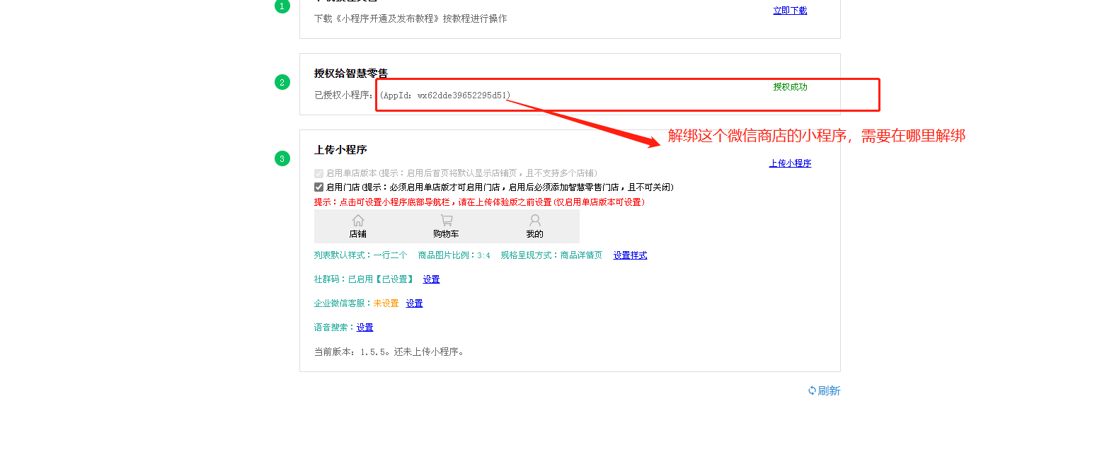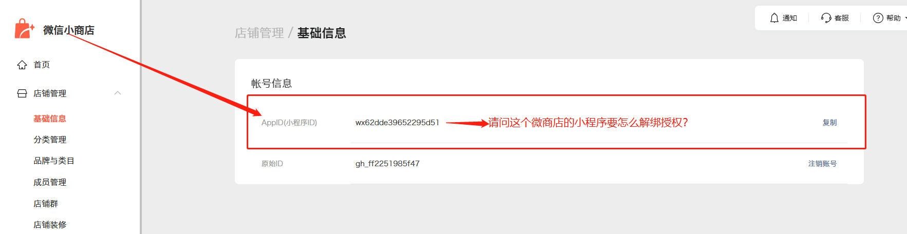 请问下,我绑了微信小商店的小程序ID,在小商店里面怎么解绑,授权的第三方商城,现在需要在后台解绑,找不到途径,咨询了客服让来这边咨询, 不知道官方这边给有工作人员可以帮忙处理