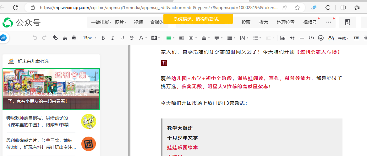 你好,点击预览和保存是否可以正常?仅有点击群发无法成功吗?