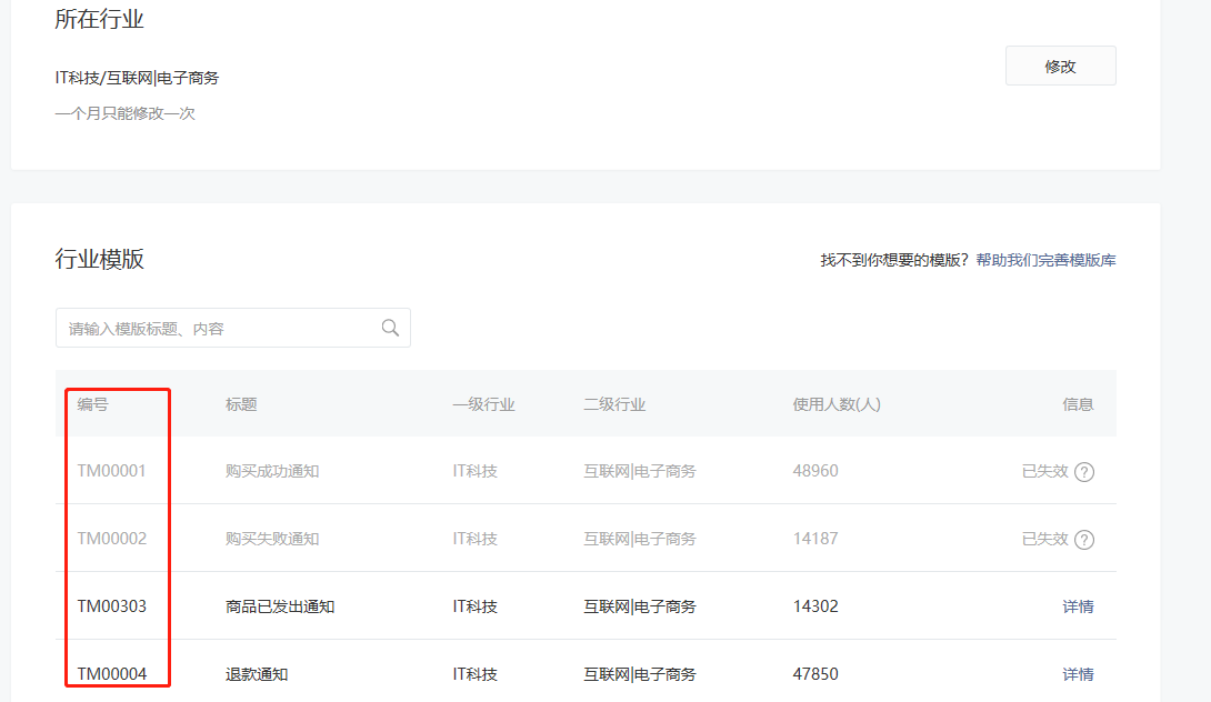 公众号模板消息中不同的行业,模板编号是否会重复呢?我指的是,编号相同,模板内容却不同。就是下图中的编号