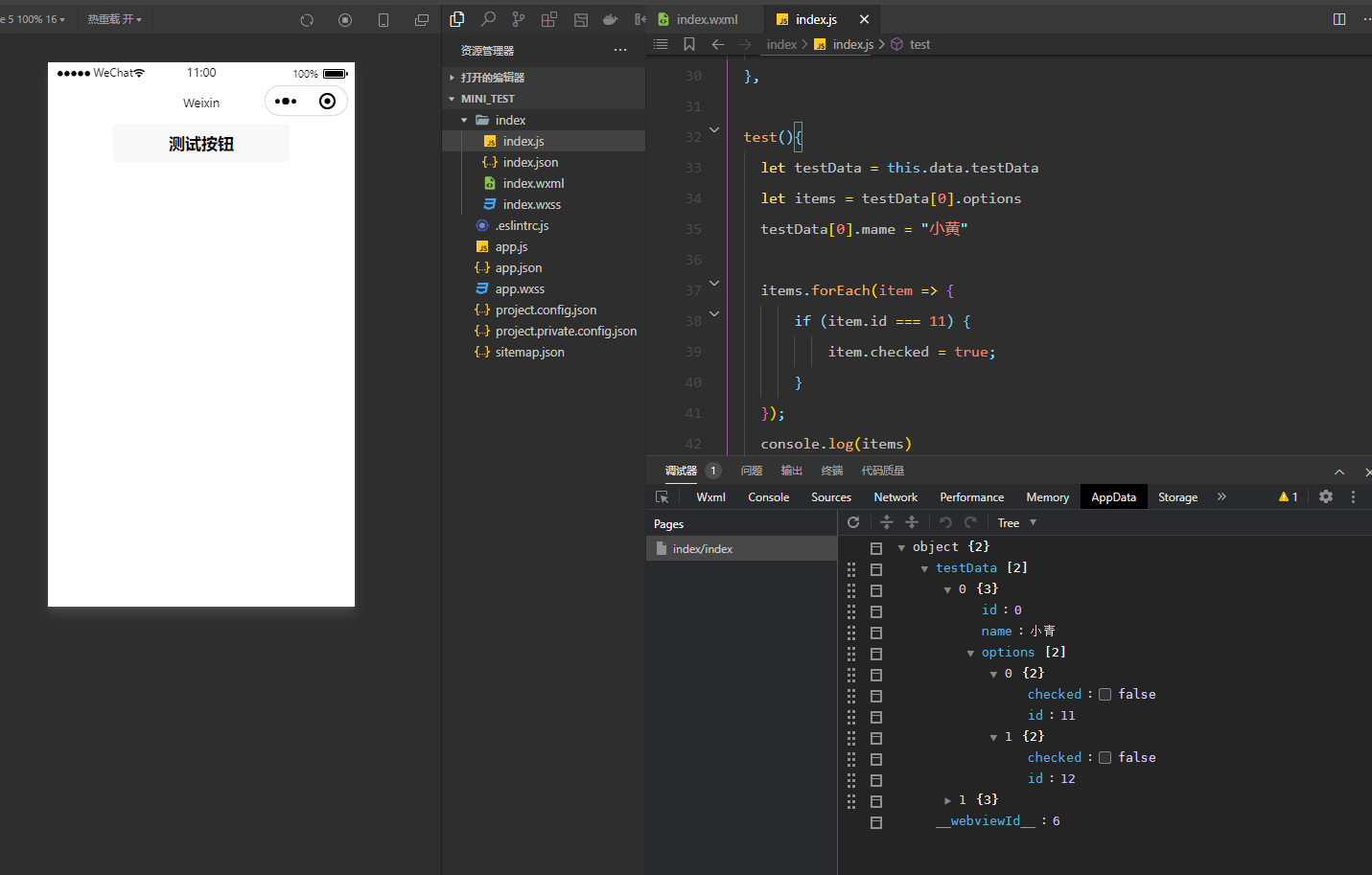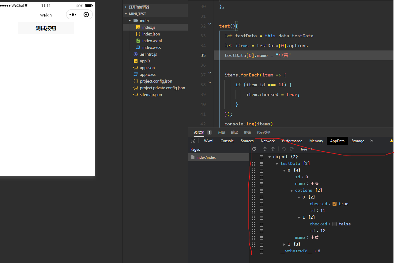 图片相关描述:在开发工具的appData 模块我们看到的是事先在data的模拟的静态数据,test()方法是点击“测试按钮”事时的响应事件,该方法中并没有使用setdata() 提交修改的数据