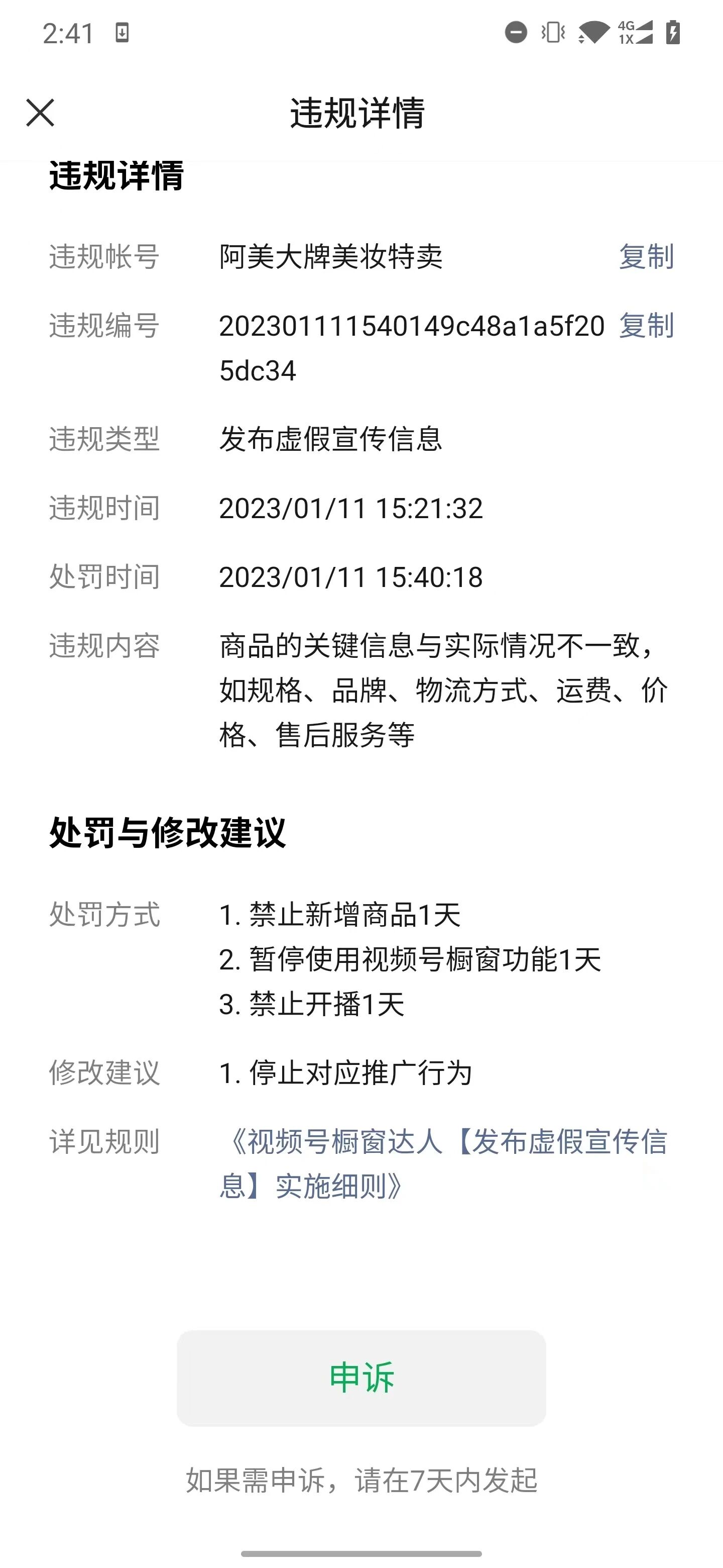 如有异议,可根据违规私信通知上的“申诉指引材料”,提供有效合理凭证进行申诉,感谢你对视频号橱窗功能的支持。