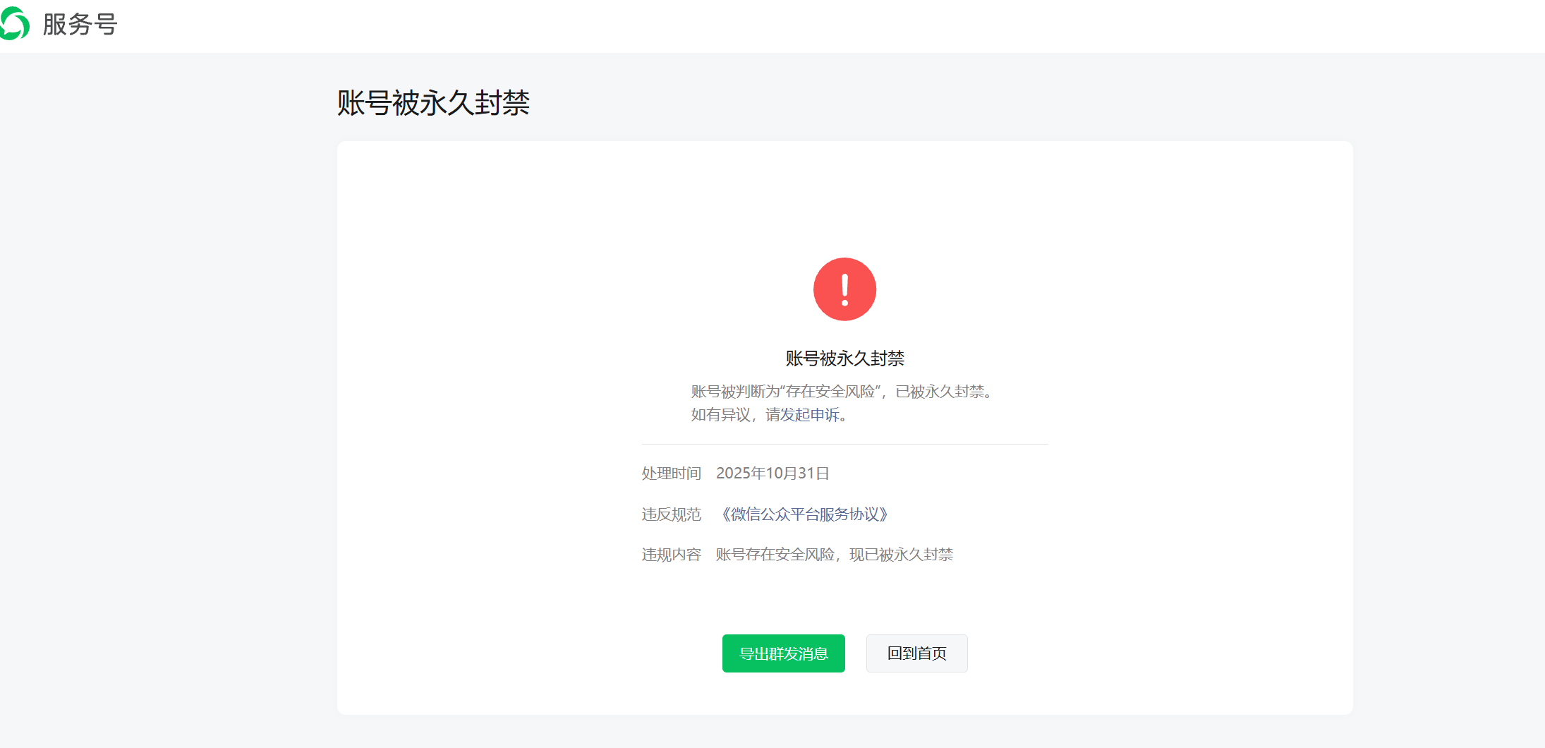 10月29号注册的服务号,什么都没有操作,第二天就被永久封禁,而且也看不到封禁的原因,请核实一下,如果是误封请给解封,如果确实存在违规,请给我说明一下违规的具体原因。