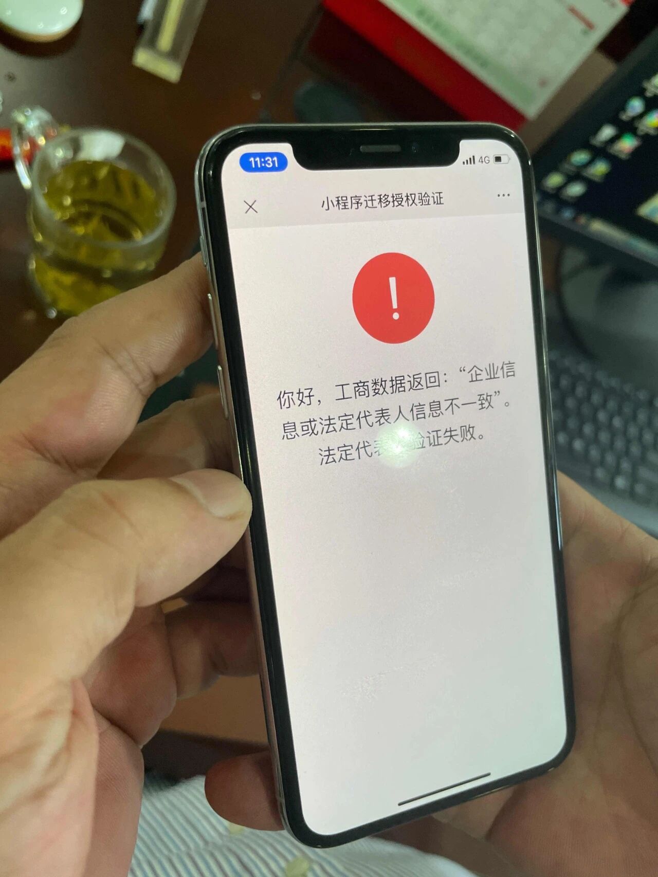问题: 办理小程序迁移,原实体法人验证时,提示错误 “你好,工商数据返回:“企业信息或法定代表人信息不一致”。法定代表人验证失败。请刷新重试”