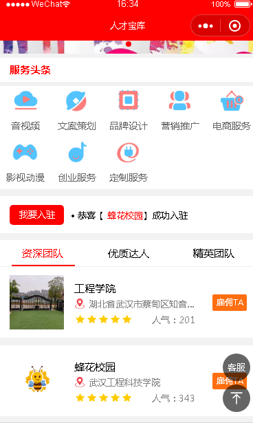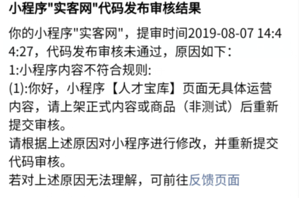你好,经核实,贵方小程序【人才宝库】版块无内容,请在小程序服务页面上架正式(非测试)内容或商品后重新提交代码审核。(详图如下)