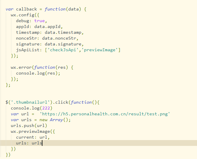 这是h5网页的代码,在网页中打开后,可以正常预览图片,但用小程序通过web-view打开这个页面,无法预览图片,但是wx.previewImage API显示调用成功