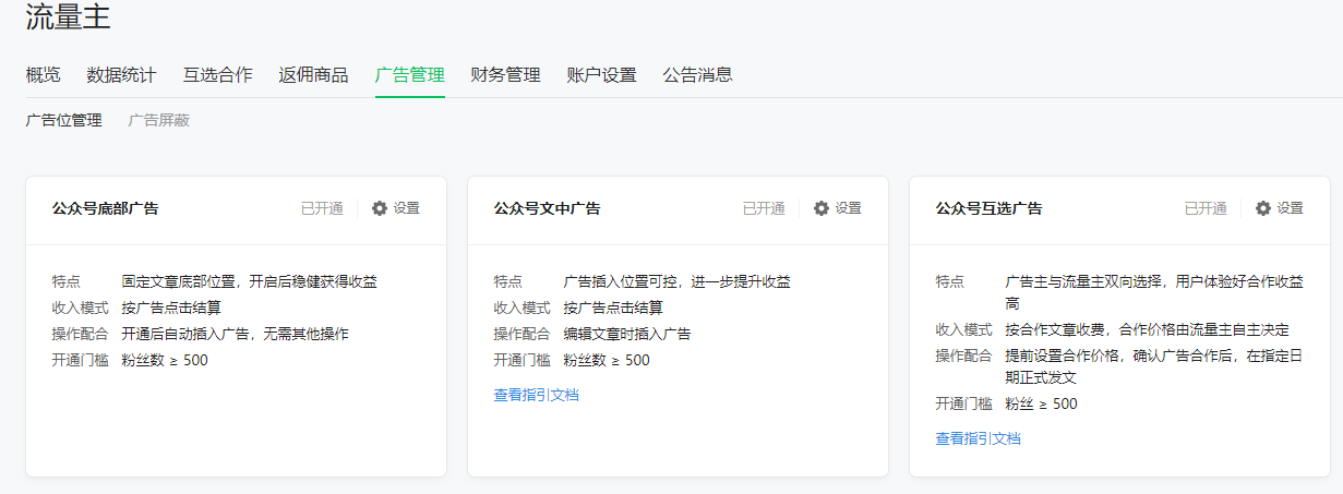 公众号流量主可在【账户设置】中选择自由开启或关闭文中广告、底部广告和互选广告,点击“设置”进行操作。