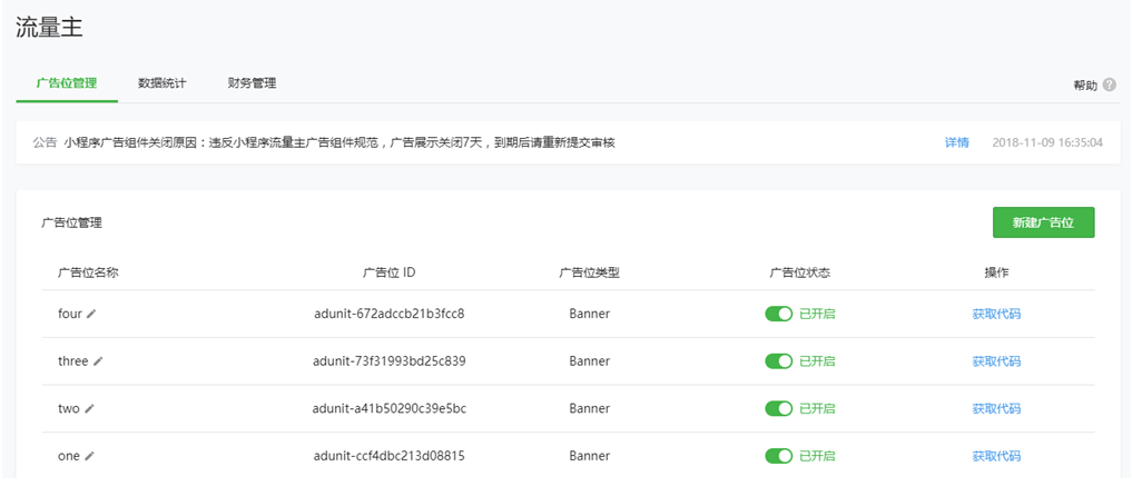 小程序流量主可在【广告位管理】中选择自由开启或关闭广告位,在“广告位状态”处点击关闭。关闭广告位后小程序将不展示广告。