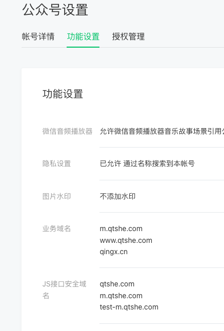 所以服务号及关联后台配置的js安全域名为都是: m.qtshe.com