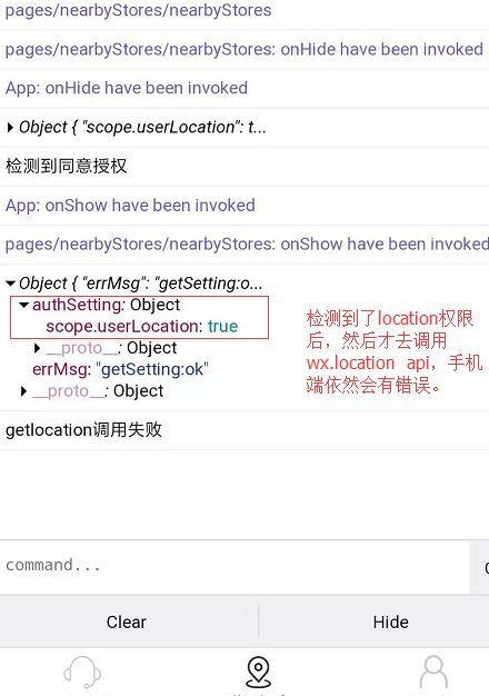 界面中使用了一个按钮,触发 打开设置,在手机端授权后(这里授权了定位),点左上返回后,这时调用wx.getLocation()依然会失败,需要再打开设置界面,再返回,这时才能调用成功(而且偶尔调用成功了,经纬度返回的是0的情况)。而在PC开发时,是可以调用成功的。这应该算是API BUG吧。