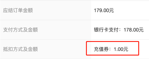遇到一个订单实际支付金额减了1元,微信平台查询订单显示抵扣方式及金额:充值券:1元