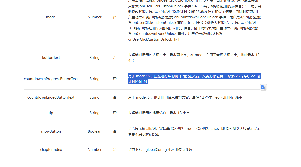 “用于 mode: 5 ,正在进行中的倒计时按钮文案,文案必须包含 ,最多 26 个字,eg: 倒计时还剩 秒“ 这里应该有个占位符{{countdown}}