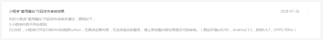 1:小程序内容不符合规则:(1):你好,小程序打开后只有title和底部button,无具体运营内容,无法体验实际服务,请上架完整内容后再提交代码审核。(测试环境wifi/4G,Andriod 5.1,微信6.6.7,OPPO R9tm)