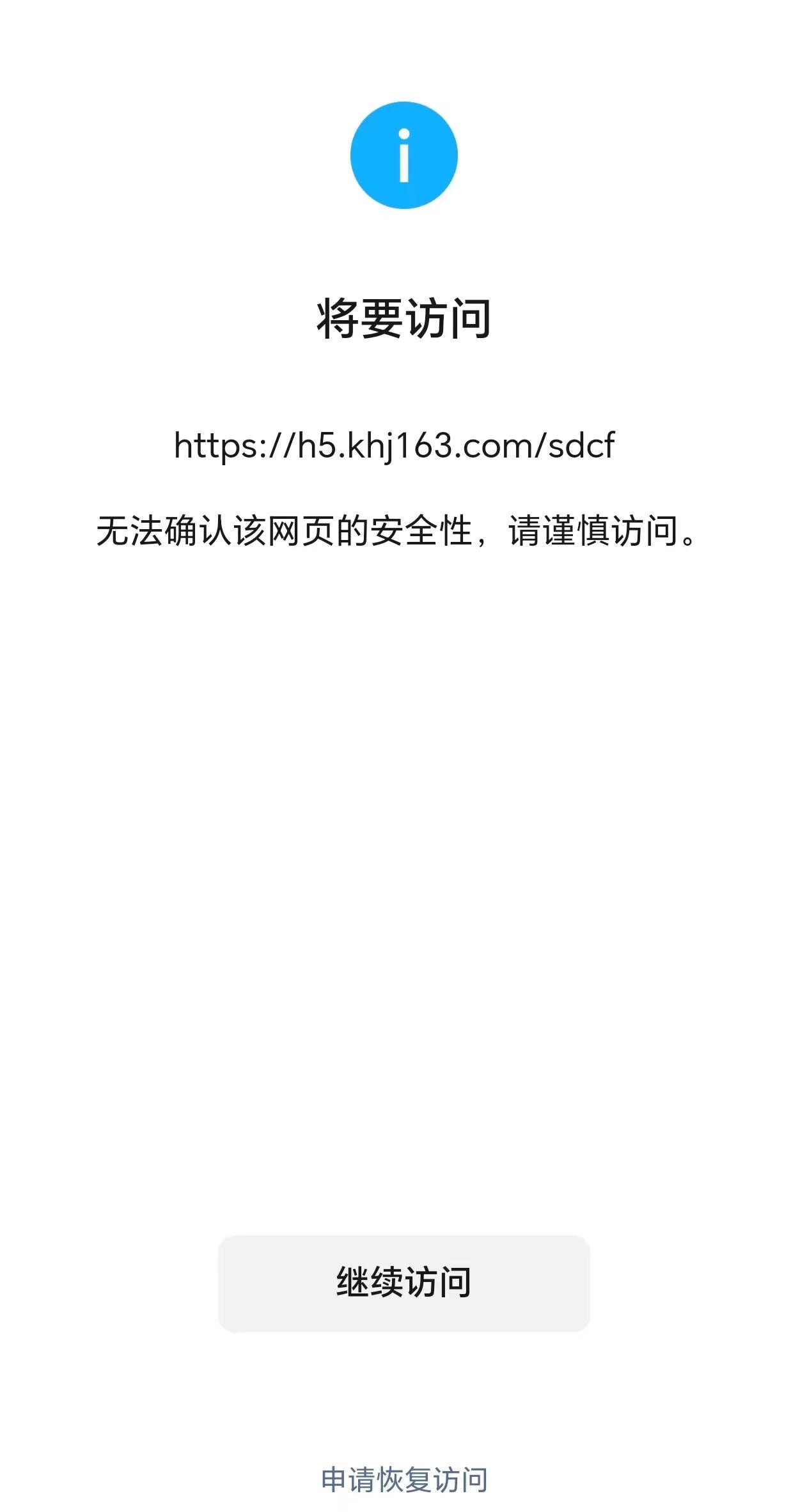 您好,域名(https://h5.khj163.com/sdcf)域名在腾讯云注册并备案通过,服务器也在腾讯云,浏览器访问正常,我是网站开发者,访问时间如图,微信访问网站出现“无法确认该网页的安全性,请谨慎访问”,经检查网页里没有不安全的内容,是微信官方网页,请核实后帮忙解除拦截,谢谢!