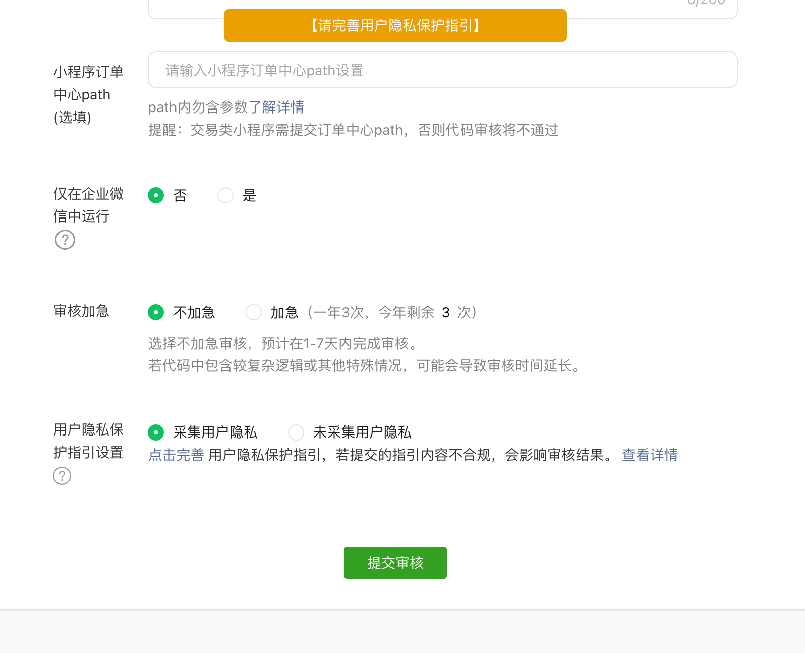 1,在提交审核时,一直提示完善隐私保护协议指引