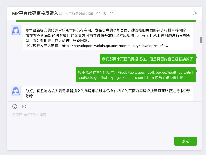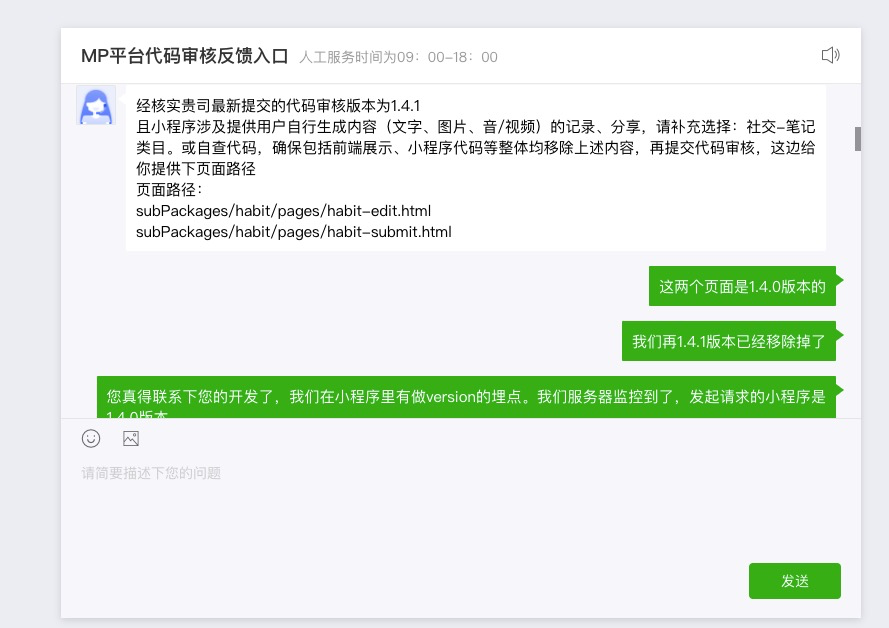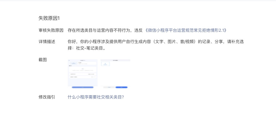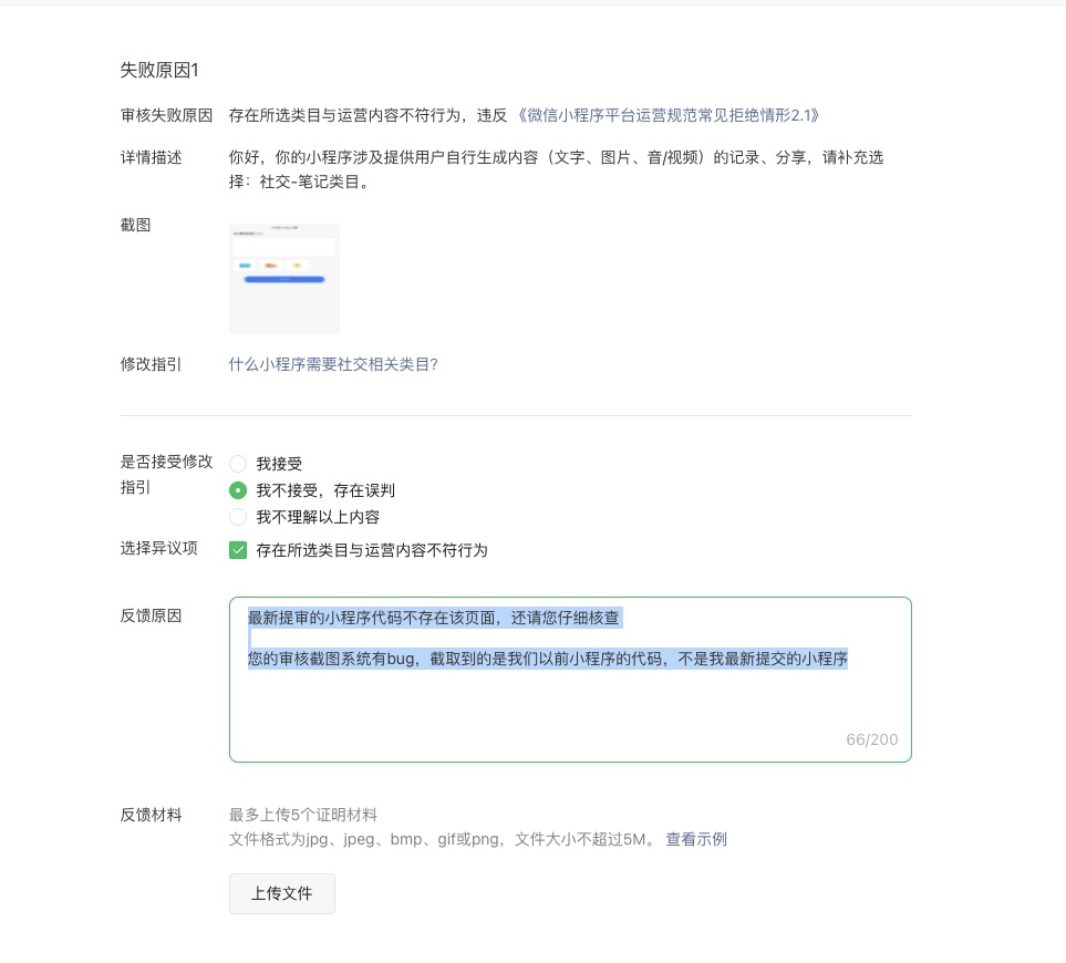 大概在一周前,我们小程序提审了个版本,该版本中含有UGC的功能,但是没有社交类目,这确实是我们的过错,审核不通过无可厚非,我们接受这个结果。由于增加社交类目,需要等待7天,我们等不了这么多天,有几个跟UGC无关的功能着急上线,而那个UGC没那么紧急。所以我们最终决定屏蔽UGC的功能,保留非UGC的功能重新提审,以求通过。