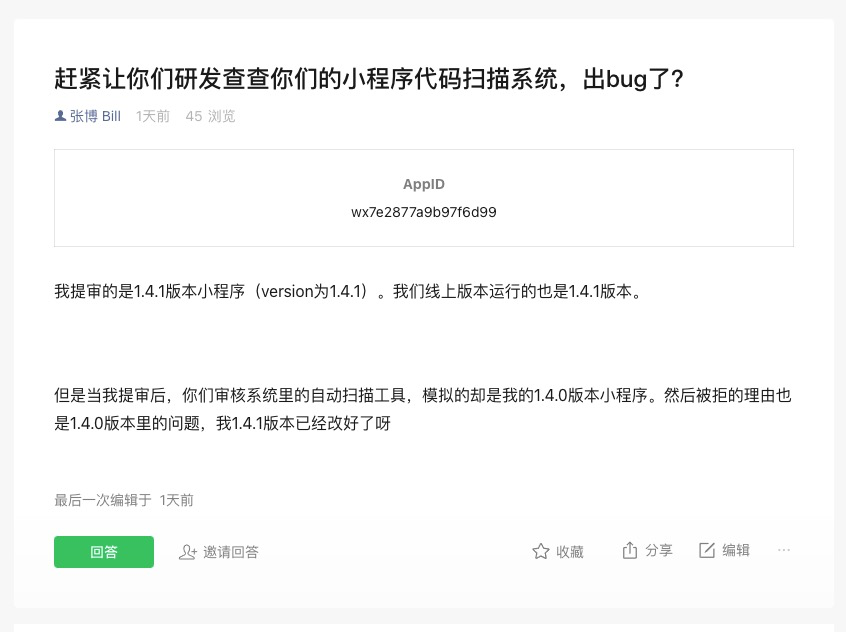 赶紧让你们研发查查你们的小程序代码扫描系统,出bug了?? - 微信开放社区 https://developers.weixin.qq.com/community/develop/doc/000a2e28a48ae8ccf91dad52451400